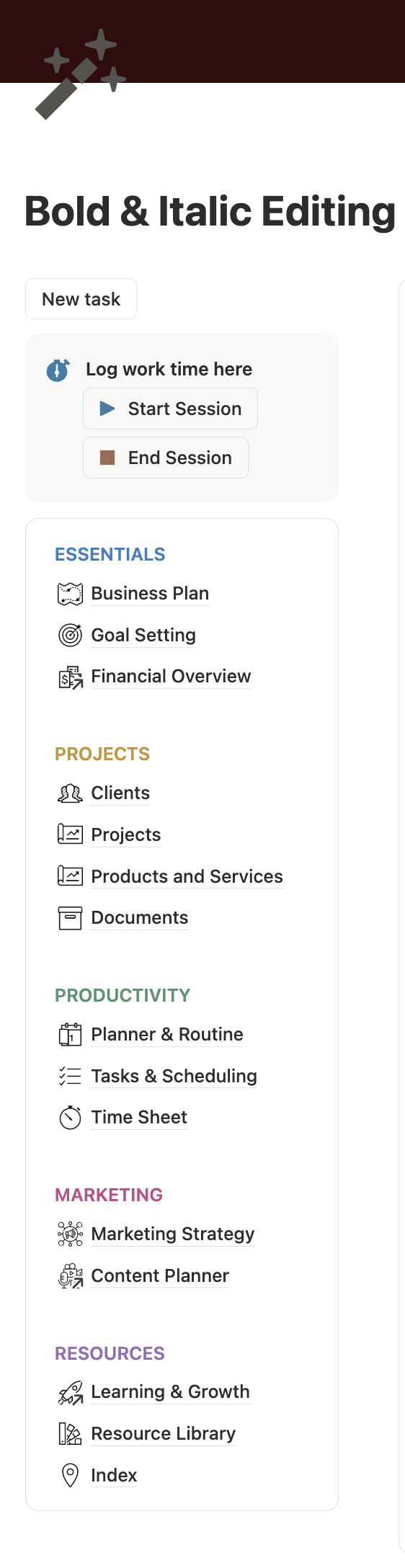 My business: client dashboards, templates, and the very system I built for my Self-Publishing Guided Workflow. Here’s a snapshot of my navigation bar: